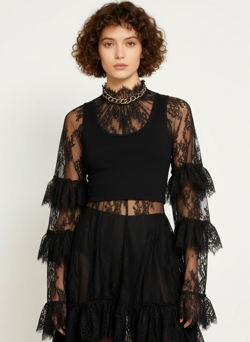 Delicate sheer details and flattering silhouette, this piece brings together elegance and comfort in one unforgettable look.